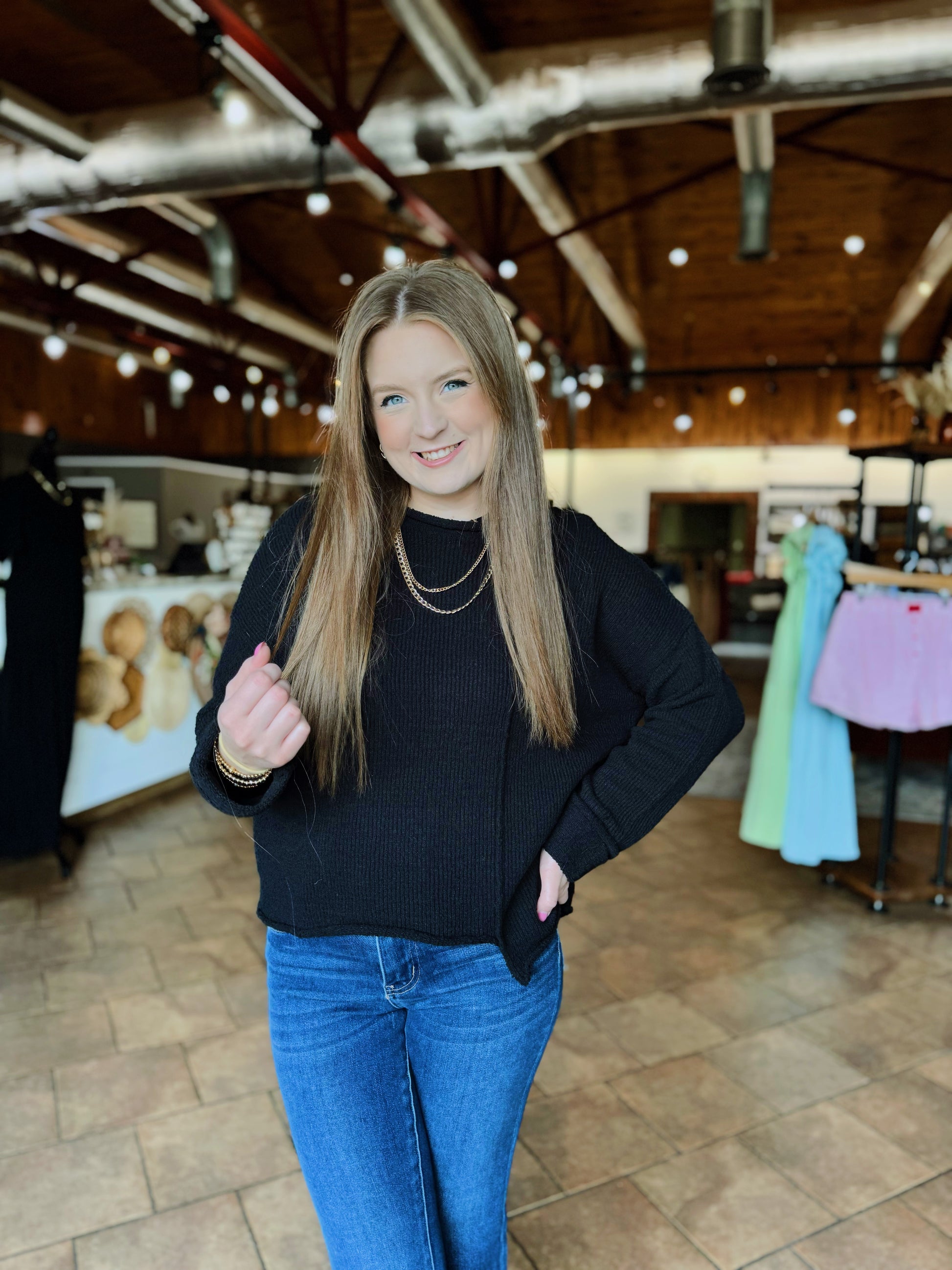 Black lightweight knit sweater with asymmetrical bottom hem.