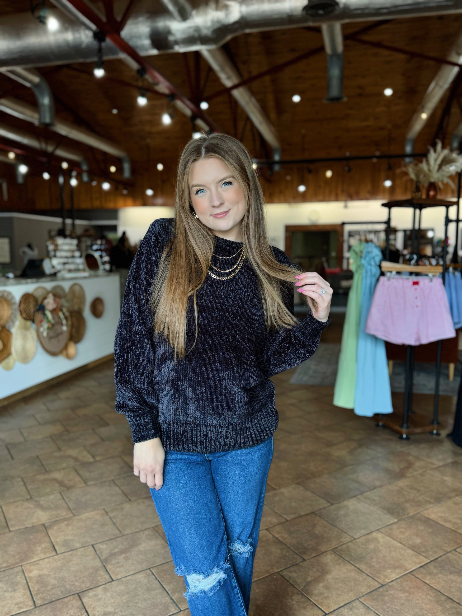 Black Chenille Balloon Sleeve Sweater