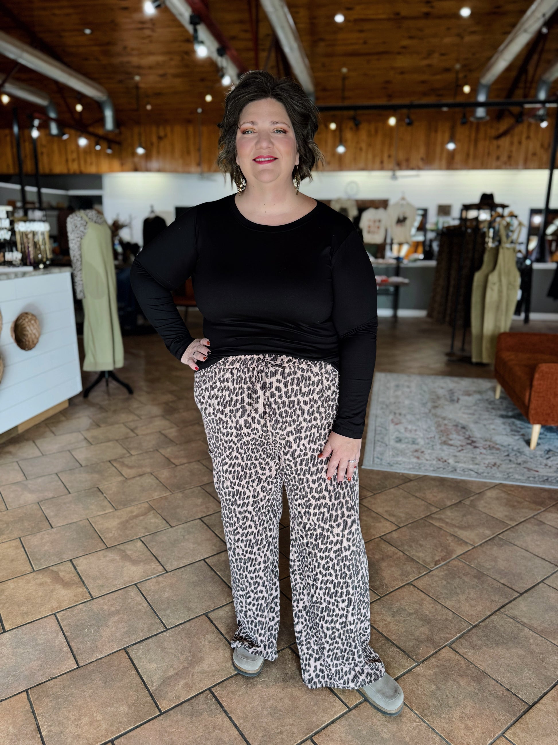Leopard print wide leg pants featuring slouchy side pockets, a drawstring waist and a soft ribbed material.
